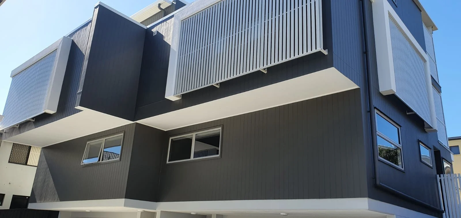 Modern multi-story apartment building with dark gray and white exterior, featuring large windows and small balconies with vertical slat railings.